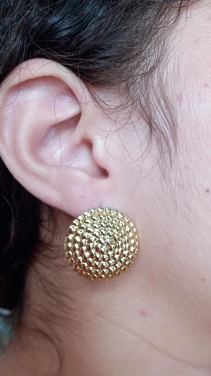 🔸 Material: Aço inoxidável dourado 🔸 Design: Círculo orgânico com textura esférica 🔸 Acabamento: Brilho intenso e durável 🔸 Indicado para: Looks modernos, casuais ou eventos especiais 🔸 Benefícios: Não escurece, não causa alergias, leve e confortável